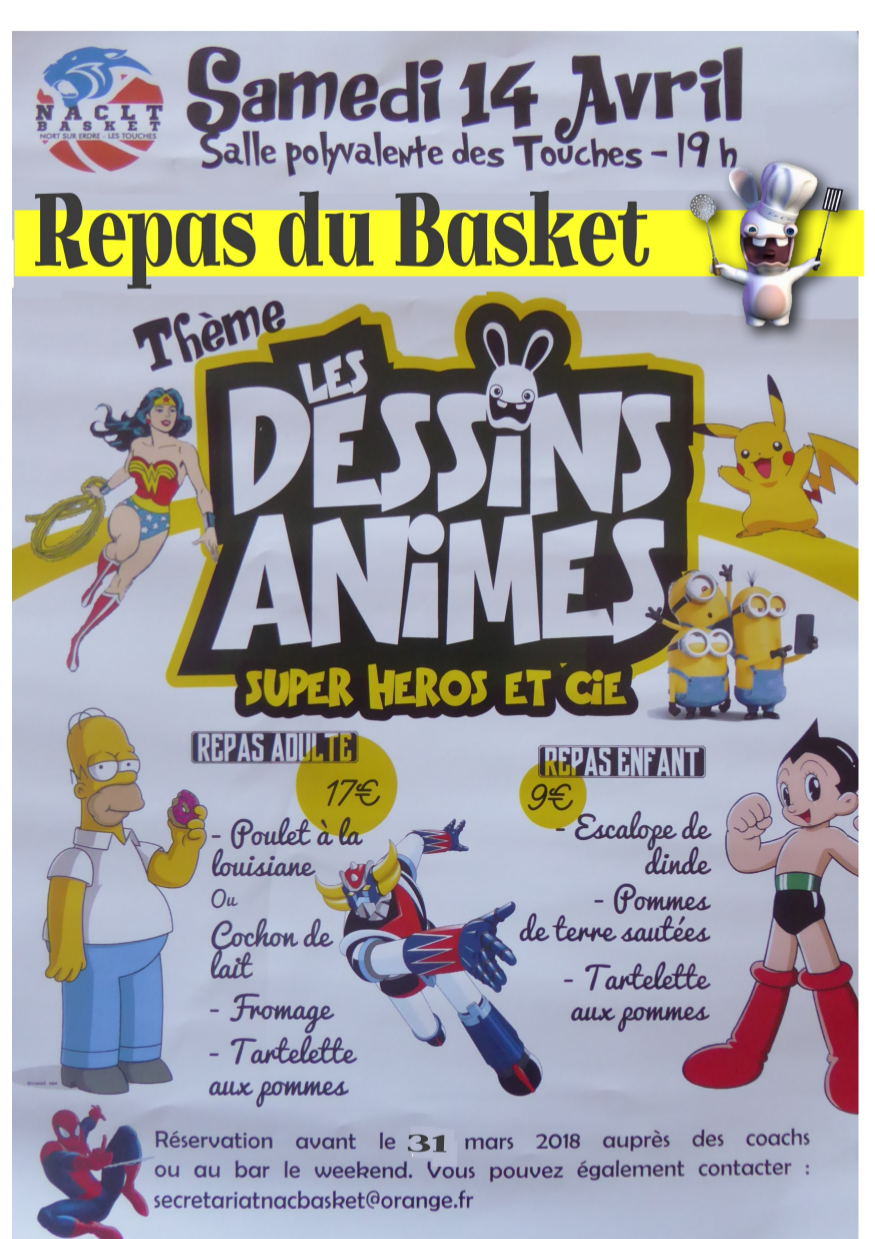 La soirée du club aura lieu le samedi 14 avril 2018 , salle polyvalente des Touches à 19h00. L’espace d’un instant, replongez avec nous dans les dessins animés qui ont bercé votre enfance. N’hésitez pas à venir revêtu de la tenue de votre personnage ou héros préféré !!! Réservation et inscription au bar les weekend ou secretariatnacbasket@orange.fr jusqu’au 31 mars dernier délai.