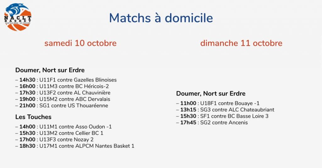 Programme du 10 et 11 octobre 2020 08/10/202008/10/2020| nacltbasketProgramme du 10 et 11 octobre 2020| 0 Comment| 07:50 Categories : Articles Post navigation Previous page Older Posts Résultats du 3 et 4 octobre 2020Next page Newer Posts Stages de la Toussaint 2020 Related Post Finales UGSEL dans Ouest-France 09/04/2019 09/04/2019 nacltbasket Finales UGSEL dans Ouest-France 0 Comments 20:00 Aujourd’hui, nous avons pu découvrir un article parlant des finales nationales féminines des lycées privés [...] Read MoreRead More Le conte des lutins bleus 06/12/2020 06/12/2020 nacltbasket Le conte des lutins bleus 0 Comments 20:57 Il était une fois, 9 petits lutins, tout de bleu vêtus, qui jouaient au basket. [...] Read MoreRead More Bilan à mi-saison et matchs Seniors déterminants dimanche 08 janvier 05/01/2017 05/01/2017 nacltbasket Bilan à mi-saison et matchs Seniors déterminants dimanche 08 janvier 0 Comments 17:50 Le rideau étant maintenant tiré sur la 1ère phase de la saison 2016-2017, alors quel [...] Read MoreRead More